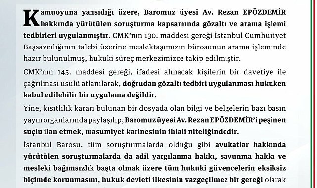(İSTANBUL) - İstanbul Barosu, "kısıtlılık kararı bulunan bir dosyada olan bilgi ve belgelerin bazı basın yayın organlarında paylaşılıp, baro üyesi avukat Rezan Epözdemir’i peşinen suçlu ilan etmenin masumiyet karinesinin ihlali niteliğinde olduğuna" dikkati çekti. İstanbul Barosundan yapılan açıklamada, baro üyesi avukat Rezan Epözdemir'in gözaltına alındığı, arama işlemi tedbirleri uygulandığı anımsatıldı.Açıklamada şunlar kaydedildi:"CMK'nın 130. maddesi gereği İstanbul Cumhuriyet Başsavcılığının talebi üzerine meslektaşımızın bürosunun arama işleminde hazır bulunulmuş, hukuki süreç merkezimizce takip edilmiştir. CMK'nın 145. maddesi gereği, ifadesi alınacak kişilerin bir davetiye ile çağrılması usulü atlanılarak, doğrudan gözaltı tedbiri uygulanması hukuken kabul edilebilir bir uygulama değildir."Peşinen suçlu ilan etmek, masumiyet karinesinin ihlali niteliğindedir"Yine, kısıtlılık kararı bulunan bir dosyada olan bilgi ve belgelerin bazı basın yayın organlarında paylaşılıp, baromuz üyesi avukat Rezan Epözdemir'i peşinen suçlu ilan etmek, masumiyet karinesinin ihlali niteliğindedir.İstanbul Barosu, tüm soruşturmalarda olduğu gibi avukatlar hakkında yürütülen soruşturmalarda da adil yargılanma hakkı, savunma hakkı ve mesleki bağımsızlık başta olmak üzere tüm hukuki güvencelerin eksiksiz biçimde korunmasını, hukuk devleti ilkesinin vazgeçilmez bir gereği olarak görmekte ve sürecin yakından takipçisi olmaya devam etmektedir."