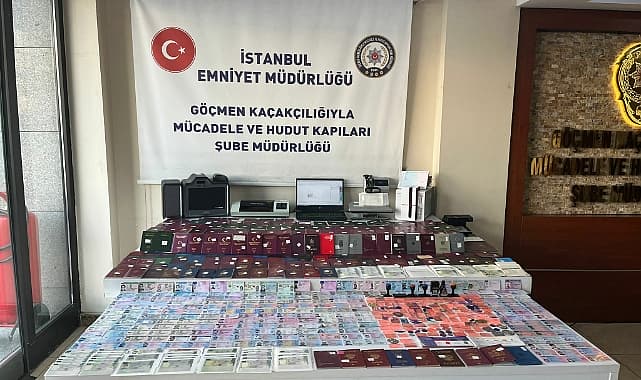 İstanbul’un Fatih ilçesinde düzenlenen operasyonda değişik ülkelere ait 330 sahte pasaport, 230 sahte kimlik ile sürücü belgesi, bin 132 sahte vize etiketi ve sahte evrak üretiminde kullanılan 3 mor ışık cihazı ele geçirildi.İstanbul İl Emniyet Müdürlüğü'nden yapılan açıklamaya göre, Göçmen Kaçakçılığıyla Mücadele ve Hudut Kapıları Şubesi ekipleri, "resmi belgede sahtecilik" suçlarıyla ilgili çalışma başlattı. Yapılan çalışmalarda Fatih’te Molla Gürani Mahallesi’nde bulunan bir adreste sahte pasaport, vize ve kimlik yaparak yabancı uyrukluların yasa dışı yollarla Türkiye’den çıkışını yapan, farklı ülkelerde bulunan kişilerle sosyal medyadan iletişime geçerek sahte pasaport üretimi yapan E.S. isimli (49) bir şüpheli belirlendi.Söz konusu adrese dün akşam saatlerinde bir operasyon düzenlendi. Operasyonda, E.S. isimli kişi yakalanarak gözaltına alındı. Adreste yapılan aramalarda ise 47 farklı ülkeye ait 330 sahte pasaport, 21 ayrı ülkeye ait 230 sahte kimlik kartı ile sürücü belgesi, 10 değişik ülkeye ait bin 132 sahte vize etiketi ve sahte evrak üretiminde kullanılan 3 mor ışık cihazı ele geçirildi.Şüpheli sorgulanmak üzere emniyete götürülürken, işlemlerine devam edildiği bildirildi.