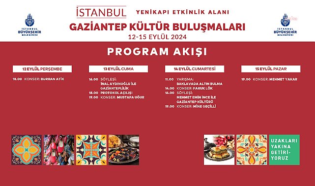 (İSTANBUL) - İstanbul Yenikapı Etkinlik Alanı’nda yapılması gelenekselleşen ‘Kültür Buluşmaları’, Gaziantep ile başladı. 12-15 Eylül günleri arasında Gaziantep Kültür Buluşması ile başlayan etkinlikler, 19-22 Eylül günlerinde Mardin ve 26-29 Eylül günleri arasında ise Sivas Kültür Buluşmaları ile devam edecek.Memleket özlemi yaşayan İstanbulluları kendi kültürleri ile bir araya getiren ‘Kültür Buluşmaları’ Gaziantep ile başladı. Perşembeden pazar gününe kadar her hafta bir ilin, kültürün tanıtımının yapıldığı alanda konserler, halk oyunları gösterileri, yemek stantları, yöresel ürün satışı gibi pek çok etkinliğe yer veriliyor.“Baklavada altın bulma yarışması”Bugün Burhan Atik konseriyle başlayan Gaziantep Kültür Buluşması, 13 Eylül Cuma günü söyleşi ve konserlerle devam edecek. Saat 16’da ‘İnal Aydınoğlu ile Gazianteplilik’ söyleşisi ardından saat 18’de protokol açılışı yapılacak. Saat 19’da Mustafa Uğur, Yenikapı Etkinlik Alanı’nda konser verecek. 14 Eylül Cumartesi günü saat 11’de Baklavada Altın Bulma yarışması düzenlenecek. Saat 14’te Faruk Kök konseri ile devam eden etkinlikte, saat 16’da ‘Mehmet Emin İnce ile Gaziantep Kültürü’ söyleşisi olacak. Aynı gün saat 19’da Mine Geçilli konseri olacak. Etkinliğin son günü 15 Eylül Pazar gününde ise saat 19’da Mehmet Yakar Konseri ile Gaziantep Kültür Buluşmaları son bulacak. Yenikapı Etkinlik Alanı’nda düzenlenen Kültür Buluşmaları; Gaziantep’ten sonra, Mardin ve Sivas Buluşmaları ile devam edecek.