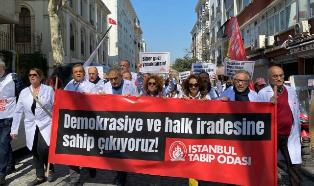 (İSTANBUL) - İstanbul Büyükşehir Belediye (İBB) Başkanı Ekrem İmamoğlu’nun gözaltına alınmasına tepki gösteren hekimler ve eczacılar, “Demokrasiden ve halk iradesinden vazgeçmeyeceğiz” diyerek beyaz önlükleriyle Saraçhane’ye yürüdü. Türk Tabipleri Birliği (TTB) Merkez Konseyi Başkanı Alpay Azap, "Bizler şunu çok iyi biliyoruz, bu ülkenin hekimleri olarak sağlıktan asla tasarruf olmaz. Ama şunu da iyi biliyoruz ki demokrasiden de özgürlükten de tasarruf olmaz. Çünkü demokrasi olmadan sağlık da olmaz. Gelecek de olmaz, insan da olmaz. O yüzden bu ülkenin hekimleri olarak biz halkımızın sağlığı için demokrasiye ve özgürlüklere de sahip çıkmak zorundayız" dedi.