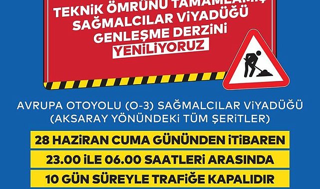 (İSTANBUL)- Okulların tatile girmesi ve trafiğin sınırlı da olsa bir miktar rahatlamasıyla birlikte İstanbul'da köprü ve yol bakımları hızlandı. Yenibosna'da üst geçit yapımından sonra dün gece de Sağmalcılar Viyadüğü'nde derz bakımı başlatıldı. İBB yetkilileri, sürücüleri trafik ve yer işaretlerine uymaları konusunda uyardı.Kentte önceki gün Yenibosna Üst Geçidi yapımı nedeniyle şerit daraltması uygulaması başlamıştı. Dün gece de Sağmalcılar Viyadüğü'nde derz çalışmaları başladı. İBB'den yapılan açıklamaya göre, Bayrampaşa Altıntepsi Mahallesi, O-3 Sağmalcılar Viyadüğü’ndeki çalışmalar 10 gün sürecek. İş kapsamında viyadüğün Aksaray yönünde bulunan köprü genleşme derzi yenilenecek. Yapısal ömrünü tamamlamış olan mevcut derzdeki çalışmalar nedeniyle 23.00 – 06.00 saatleri arasında Aksaray yönündeki tüm şeritler trafiğe kapatılacak. Kapalı şeritler 06.00’da tekrar trafiğe açık olacak. Sürücülerin trafik levhaları ve yer işaretlerine uymaları gerekiyor.
