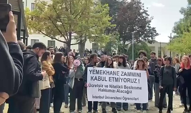 (İSTANBUL) İstanbul Üniversitesi öğrencileri, yemekhane ücretlerine yapılan zammı kampüs içinde yürüyüş ve basın açıklamasıyla protesto etti. Öğrenciler, yürüyüş boyunca “Beslenme hakkımız gasp edilemez”, “Üniversiteler bizimdir, bizimle özgürleşecek” sloganları attı. Eylem sırasında, geçtiğimiz yılki yemekhane protestolarına katıldığı için sınır dışı edilmek istenen öğrenci Rana Haluk Babazade’nin mektubu da okundu. Üniversite bahçesinde toplanan öğrencilerin yürüyüş çağrısına üniversite güvenliği müdahale ederken, protesto sırasında öğrenciler ile güvenlik görevlileri arasında arbede yaşandı.İstanbul Üniversitesi'nde öğrenciler, yemekhane ücretlerine yapılan zammı kampüs içinde yürüyüş ve basın açıklamasıyla protesto etti. Üniversitenin bahçesinde kulüp stantlarının bulunduğu alanda toplanan öğrenciler, havuzlu bahçe önünden yürüyüş çağrısı yapmak istedi. Ancak üniversite güvenliği, öğrencilerin çağrısını engelledi ve megafonlarına el koymak istedi. Bir öğrenci, yaşanan arbedede megafonu elinden alınmaya çalışılırken şöyle konuştu:“Günde 100 lira KYK ücretiyle, 52,5 lira olan yemekhanede yemek yiyemiyoruz dediğimiz için biz suçlu olduk. Okulun polisi, güvenliği kendi öğrencisine saldırıyor. Yazıklar olsun size.”“Beslenme hakkımız gasp edilemez”Öğrenciler, yürüyüş boyunca “Beslenme hakkımız gasp edilemez”, “Üniversiteler bizimdir, bizimle özgürleşecek” sloganları attı. Eylem sırasında, geçtiğimiz yılki yemekhane protestolarına katıldığı için sınır dışı edilmek istenen öğrenci Rana Haluk Babazade’nin mektubu da okundu.Rana Haluk Babazade’nin mektubu: “Bizi güçlü kılan dayanışmamızdır”Babazade mektubunda, üniversite öğrencilerine dayanışma mesajı gönderdi:“Bir yıl önce yemekhane protestolarında ben de aranızdaydım. O zaman nasıl güçlü ve öfkeli hissediyorsam, şimdi de aynıyım. Bu rejim kadınları, lubunyaları, göçmenleri, hayvanları, yoksulları görülmez kılmaya çalışıyor. En temel hakkımız olan beslenme hakkımız bile gasp ediliyor. Ancak bizi güçlü kılan, birlikte örgütlülüğümüz, mücadelemiz ve dayanışmamızdır. Özgürlük, biz neredeysek orada. Onlar nerede olursa olsun, biz de öfkemizle, örgütlü toplumsal mücadelemizle, kalbimizde büyüyen enternasyonel dayanışmalarımızla daha çok var olacağız.”
