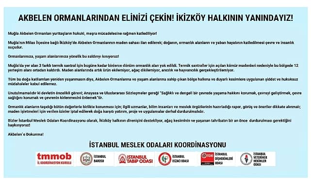 İstanbul Tabip Odası (İTO), Muğla Akbelen Ormanı'nda devam eden ağaç kesimiyle ilgili “Doğa katliamları yeniden yaşanmasın diye, Akbelen Ormanı'na ve yaşam alanlarına sahip çıkan bölge halkına ve duyarlı kesimlere uygulanan şiddet ve hukuksuz müdahaleler kabul edilemez. Devletin öncelikli görevi; Anayasa ve uluslararası sözleşmeler gereği sağlıklı ve dengeli bir çevrede yaşama hakkını korumaktır” açıklamasını yaptı.İstanbul Tabip Odası, Muğla’nın Milas ilçesi İkizköy mevkiindeki Akbelen Ormanı'nda maden sahasının genişletilmesi amacıyla devam eden ağaç kesimiyle ilgili Twitter hesabından açıklama yayınladı. Açıklamada şunlara yer verildi: “AKBELEN ORMANI KATLEDİLİYOR: Muğla Akbelen OrmanI, yurttaşların hukuki, meşru mücadelesine rağmen katlediliyor. Muğla'nın Milas İlçesine bağlı İkizköy'de Akbelen Ormanı'nda maden sahası ilan edilerek; doğanın, ormanlık alanların ve yaban hayatının katledilmesi çevre ve insanlık suçudur. TERMİK SANTRAL İÇİN BİNLERCE DÖNÜM ORMANLIK ALAN YOK EDİLDİ: Ormanlarımıza, yaşam alanlarımıza yönelik bu saldırıyı kınıyoruz. Muğla'da yer alan 3 farklı termik santral için bugüne kadar binlerce dönüm ormanlık alan yok edildi. Termik santraller için açılan kömür madenleri nedeniyle bu bölgede 12 yerleşim alanı ortadan kaldırdı. Maden alanlarında artık ürün ekilemiyor, ağaç dikilemiyor, arıcılık ve hayvancılık gerçekleştirilemiyor. BU KATLİAMLAR YENİDEN YAŞANMASIN DİYE: Tüm bu doğa katliamları yeniden yaşanmasın diye, Akbelen Ormanı'na ve yaşam alanlarına sahip çıkan bölge halkına ve duyarlı kesimlere uygulanan şiddet ve hukuksuz müdahaleler kabul edilemez. Unutulmamalıdır ki devletin öncelikli görevi; Anayasa ve uluslararası sözleşmeler gereği sağlıklı ve dengeli bir çevrede yaşama hakkını korumak, çevreyi geliştirmek, çevre sağlığını korumak ve çevrenin kirlenmesini önlemektir. MESLEK ÖRGÜTLERİNİN HAZIRLADIĞI RAPORLAR DİKKATE ALINMALI: Ormanlık alanların taşıdığı bütün değerlerle birlikte korunması için; ilgili uzmanlar, bilim insanları ve meslek örgütlerinin hazırladığı rapor, görüş ve öneriler dikkate alınmalı; maden işletmeleri için verilen izinler iptal edilerek doğa karşıtı yatırım, proje ve uygulamalar derhal durdurulmalıdır. Bizler İstanbul Meslek Odaları Koordinasyonu olarak, İkizköy halkının direnişini destekliyor, ağaç kesiminin ve yaşanan tahribatın bir an önce durdurulması gerektiğini haykırıyoruz.”