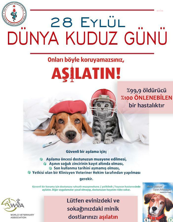 İstanbul Veteriner Hekimler Odası (İVHO), Türkiye'de yılda 250 bin civarında kuduz riskli temas kaydedildiğini, son dönemde de 2 kişinin kuduz nedeniyle yaşamını yitirdiğini belirterek, insanoğlunun doğayı ve hayatı paylaştığı can dostlarının yılda bir kez aşılanması için çağrıda bulundu.İVHO, "28 Eylül Dünya Kuduz Günü" dolaysıyla yazılı bir açıklama yaptı. Açıklamada, kuduzun, bilinen en eski zoonoz (hayvanlardan insanlara geçebilen) hastalıkların başında geldiği hatırlatıldı. Her yıl tüm dünyada ve ülkemizde kuduz nedeniyle insanlar ve de hayvanlar öldüğü belirtilen açıklamada, "Bu hastalıkla baş edebilmek için bütün imkanlara sahip olunmasına rağmen, özellikle Asya ve Afrika ülkelerinde alınan önlemler yetersiz kalmakta, Kuduz vakalarının önüne geçilememektedir" denildi.28 Eylül 2007’den bu yana 17. yılı kutlanacak olan Dünya Kuduz Günü'nün bu yıl, Dünya Sağlık Örgütü tarafından belirlenen temasının "Hepimiz birimiz, birimiz bütün sağlık için" olduğunun duyurulduğu hatırlatılan açıklamada, şu değerlendirmelere yer verildi:"TEK KUDUZ VAKASI ENGELLENEMEDİĞİNDE HİÇ KİMSENİN GÜVENDE OLMAZ: Kuduz olan insan ya da hayvanın, atak bir şekilde çevresine saldırarak hastalığı yayması ve dramatik bir şekilde ölmesi, kuduzu diğer zoonozlardan ayrı olarak değerlendirmeyi zorunlu kılmaktadır. Bu nedenle tek kuduz vakası engellenemediğinde hiç kimsenin sağlığı güvende olmaz gerçeğinin altı çizilmektedir. Ayrıca 'sağlığın seçilmiş birkaç kişinin değil, herkesin hakkı olduğu' vurgulanmaktadır.GEREKLİ ADIMLARIN ATILMASI ZORUNLULUKTUR: Pandemi ile zoonoz hastalıkların önlenebilmesi adına duyarlılığın arttığı bir dönemde, kuduz kontrol programları ve 'Tek Sağlık' anlayışının uygulanabilir hale gelmesi için gerekli adımların atılması bir zorunluluktur.