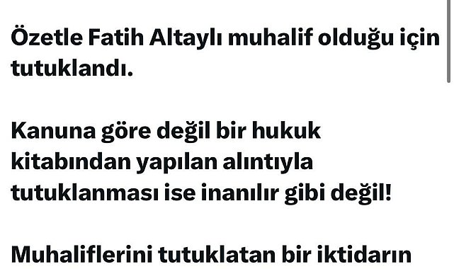 (ANKARA) - İYİ Parti Grup Başkanvekili Buğra Kavuncu, gazeteci Fatih Altaylı'nın muhalif olduğu için tutuklandığını belirterek, "Baskıyla, tehditle, insanları susturarak ve korkutarak bu büyük ve köklü ülkeyi yönetemezsiniz. Fatih Altaylı'nın yanındayız'' ifadelerini kullandı. Buğra Kavuncu, sosyal medya hesabından yaptığı açıklamada, Fatih Altaylı'nın tutuklanmasına tepki gösterdi. Kavuncu açıklamasında, "Fatih Altaylı'nın tutuklanmasının asıl gerekçesi son zamanların en çok izlenen yayıncısı olması ve kamuoyunu etkilemesi. Özetle Fatih Altaylı muhalif olduğu için tutuklandı. Kanuna göre değil bir hukuk kitabından yapılan alıntıyla tutuklanması ise inanılır gibi değil. Muhaliflerini tutuklatan bir iktidarın yönetim sisteminin tanımı nedir? Baskıyla, tehditle, insanları susturarak ve korkutarak bu büyük ve köklü ülkeyi yönetemezsiniz. Fatih Altaylı'nın yanındayız'' ifadelerine yer verdi.
