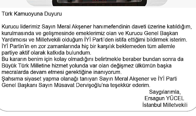 (ANKARA) - İYİ Parti Kurucu Genel Başkan Yardımcısı Ahmet Ersagun Yücel, partisinden istifa ettiğini duyurdu. İYİ Parti'nin Kurucu Genel Başkan Yardımcısı ve İstanbul Milletvekili Ahmet Ersagun Yücel X hesabından yaptığı paylaşımla istifa ettiğini açıkladı. Yücel yaptığı paylaşımda şu ifadelere yer verdi: "Kurucu liderimiz Sayın Meral Akşener hanımefendinin daveti üzerine katıldığım, kurulmasında ve gelişmesinde emeklerimiz olan ve Kurucu Genel Başkan Yardımcısı ve Milletvekili olduğum İYİ Parti’den istifa ettiğimi bildirmek isterim."