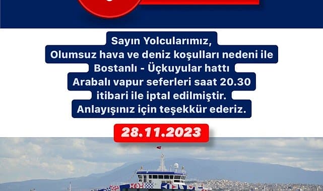 İzmir’i etkisi altına alan sağanak yağış ve fırtınadan deniz ulaşımı da olumsuz etkilendi. Bostanlı- Üçkuyular arasındaki arabalı vapur seferleri iptal edildi.İzmir'de deniz ulaşımını sağlayan İZDENİZ’den yapılan açıklama şöyle:“Sayın yolcularımız, olumsuz hava ve deniz koşulları nedeni ile Bostanlı-Üçkuyular hattı ararabalı vapur seferleri saat 20.30 itibariyle iptal edilmiştir. Anlayışınız için teşekkür ederiz.”