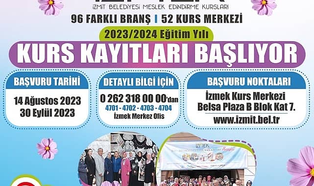 İzmit Belediyesi ve İzmit Halk Eğitim Merkezi Müdürlüğü ortaklığında faaliyetlerine devam eden İzmit Meslek Edindirme Kursları’nda (İZMEK) yeni dönem kayıtları başladı.İZMEK, 52 kurs merkezinde 96 branşta 190 usta öğreticisi ile yeni döneme hazırlanıyor. Her yıl binlerce kişiye meslek ve el becerisi kazandıran İZMEK’te yeni dönem kayıtları başladı. Kadın, erkek, genç, yaşlı binlerce kişiye hizmet veren İZMEK, 2023-2024 eğitim-öğretim dönemi için bugünden itibaren hem çevrim içi hem yüz yüze başvuruları almaya başlıyor.Vatandaşlar, 14 Ağustos (bugün) itibarıyla www.izmit.bel.tr adresinden ya da İzmit Belediyesi Belsa Plaza B Blok 7. Kat Kadın ve Aile Hizmetleri Müdürlüğü’nden başvuru yapabilecek.