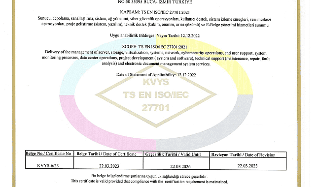 Kişisel Verilerin Korunması Kanunu (KVKK) uyumluluğunda öncü olan İzmir Büyükşehir Belediyesi, uluslararası ISO 27701 Kişisel Veri Güvenliği Standardını kazanarak bu unvanı alan ilk Büyükşehir Belediyesi oldu.2018 yılından itibaren ISO 27001 Bilgi Güvenliği Standardına sahip olan İzmir Büyükşehir Belediyesi, 2016’da yürürlüğe giren Kişisel Verilerin Korunması Kanunu’na (KVKK) uyum amacıyla attığı adımlarla da öncü kamu kurumu olmaya devam ediyor. KVKK uyumluluğunu ilk tamamlayan resmi kurumlardan olan İzmir Büyükşehir Belediyesi, uluslararası ISO 27701 Kişisel Veri Güvenliği Standardını kazanarak bu unvanı alan ilk Büyükşehir Belediyesi oldu. Büyükşehir, birçok belediye ve resmi kuruma konu hakkında eğitimler ve danışmanlıklar vererek katkı sağlıyor.VERİ GÜVENLİĞİNE ULUSLARARASI TEYİTISO 27701 Standardı, uluslararası yönetim sistemi standardı olarak kuruluşların kişisel bilgileri nasıl yönetmesi gerektiği dahil olmak üzere gizliliğin korunması konusunda kılavuzluk sağlıyor ve dünya genelindeki gizlilik düzenlemelerine uygunluğu için çerçeve sağlıyor. Bu standarda sahip olmak kuruluşta verilerin etkin bir şekilde korunduğunun ve yönetildiğinin uluslararası düzeyde ispatı olarak kabul ediliyor.