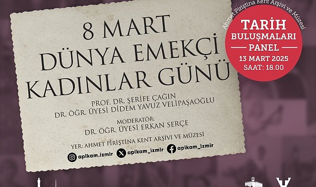 (İZMİR) - İzmir Büyükşehir Belediyesi Kent Arşivi ve Müzeler Şube Müdürlüğü ve Tarih Vakfı iş birliğinde “Tarih Buluşmaları” adıyla yapılan söyleşi ve panel dizisi, 8 Mart Dünya Emekçi Kadınlar Günü paneline sahne olacak. 13 Mart Perşembe günü saat 18.00’de APİKAM’da başlayacak panel, kadın emeğinin ekonomik, kültürel, sanatsal, düşünsel anlamda toplumsal gelişime sunduğu katkıya, kadınların bu alandaki sorunlarına ve çözüm önerilerine odaklanacak.Ahmet Piriştina Kent Arşivi ve Müzesi’ndeki (APİKAM) “Tarih Buluşmaları” bu kez kadın emeğinin farklı yönleriyle ele alınacağı 8 Mart Dünya Emekçi Kadınlar Günü paneliyle devam edecek. 13 Mart Perşembe günü yapılacak panel, kadın emeğinin ekonomik, kültürel, sanatsal, düşünsel anlamda toplumsal gelişime sunduğu katkıya, kadınların bu alandaki sorunlarına ve çözüm önerilerine odaklanacak. Panel, Dokuz Eylül Üniversitesi Buca Eğitim Fakültesi Türkçe ve Sosyal Bilimler Eğitimi Bölümü’nden Dr. Öğretim Üyesi Erkan Serçe moderatörlüğünde yapılacak. Panelin konuklarından Ege Üniversitesi Edebiyat Fakültesi Türk Dili ve Edebiyatı Bölümü’nden Prof. Dr. Şerife Çağın, “İzmir'in Öncü Kadın Yazarlarından Vedide Baha Pars” başlıklı bir konuşma yapacak. İzmir Ekonomi Üniversitesi Güzel Sanatlar ve Tasarım Fakültesi İç Mimarlık ve Çevre Tasarımı Bölümü Öğretim Üyesi Dr. Didem Yavuz Velipaşaoğlu ise “Hereke Fabrikası’nda Emek Dokusu” konu başlığıyla bir sunum yapacak.