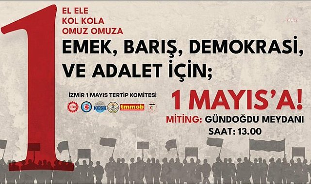 (İZMİR) - İzmir’de 1 Mayıs Emek ve Dayanışma Günü, Gündoğdu Meydanı’nda kutlanacak. İzmir’de DİSK, KESK, TMMOB, TTB, siyasi partiler, meslek odaları ve dernekler 1 Mayıs kutlamaları için yurttaşları Gündoğdu Meydanı’na çağırdı.Türk-İş Ege Bölge Temsilciliği Alsancak Limanı'ndan, KESK Cumhuriyet Meydanı’ndan, TMMOB Kıbrıs Şehitleri Caddesi’nden, DİSK ise Basmane Meydanı’ndan kortej halinde yürüyerek, kutlamalar için Gündoğdu Meydanı'na gelecek.Meydandaki 1 Mayıs Emek ve Dayanışma Günü kutlamaları saat 13.00'te başlayacak. Kutlamalar, İlkay Akkaya'nın konseriyle sona erecek.