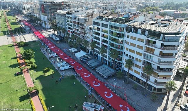 İZMİRLİLER 350 METRELİK DEV BAYRAĞI TAŞIYACAK İzmirliler, etkinliklere 9 Eylül Cumartesi gününe Büyükşehir Belediyesi tarafından düzenlenen 101.Yıl Zafer Yürüyüşü ile başlayacak. Saat 09.00'da Basmane Karakolu önünden başlayacak tarihi yürüyüş, Cumhuriyet Meydanı'nda son bulacak. Türk Ordusu'nun İzmir'e girerken kullandığı güzergah üzerinde düzenlenen yürüyüşte Gaziler, Anafartalar ve İkiçeşmelik caddelerini takip edecek İzmirliler, 350 metre uzunluğundaki dev Türk bayrağını birlikte taşıyacak. Cumhuriyet Meydanı'ndaki törenler, saat 10.00'da Atatürk Anıtı'na çelenk sunumu, saygı duruşu ve İstiklal Marşı ile başlayıp, ardından Hükümet Konağı'ndaki bayrak töreni ile devam edecek. Cumhuriyet Meydanı, saat 11.15' ten itibaren gösterilerin yer aldığı kutlamaları izlemek isteyen on binlerce İzmirliye kucak açacak. İzmir Büyükşehir Belediye Başkanı Tunç Soyer, burada İzmirlilere hitap edecek. Programda Büyükşehir Belediyesi Dans ve Ritim Topluluğu gösterisi, vals, tango, zeybek gösterileri ve İzmir Büyükşehir Belediyesi Bandosu da yer alacak.