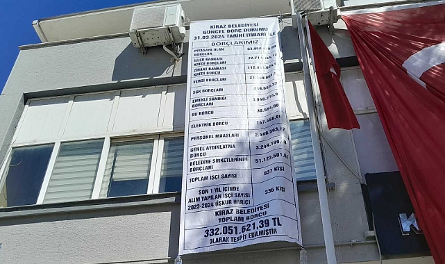31 Mart seçimlerinden sonra AKP’den CHP’ye geçen İzmir Kiraz Belediyesi’nin mali tablosu belediye binasına asıldı. Kiraz Belediyesi’nin toplam borcunun 332 milyon 51 bin 621 TL olduğu, belediyeye son bir yıl içinde 336 kişinin işe alındığı görüldü.