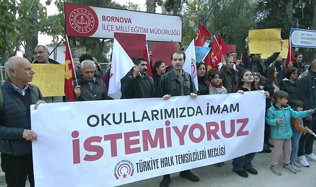 (İZMİR)- ÇEDES projesi kapsamında İzmir'in Bornova ilçesinde okullara imam, müezzin, vaiz ve kuran kursu hocası görevlendirilmesi Türkiye Halk Temsilcileri Meclisi üyeleri tarafından protesto edildi.Bornova İlçe Milli Eğitim Müdürlüğü önünde toplanan grup adına öğrenci velisi Murat Mert tarafından okunan basın açıklamasında, "Bornova İlçe Milli Eğitim Müdürlüğü, ilçede bulunan 98 okula ÇEDES projesi kapsamında imam ve din görevlisi atadı. Geçtiğimiz yıllarda da proje kapsamında görevlendirmeler yapılmış ama tepkiler gelince geri adım atılmıştı. Bu kez ilçede AKP İzmir İl Başkanı Bilal Saygılı'nın adını taşıyan caminin ÇEDES projesinin dayatılması için karargah olarak seçildiği anlaşılıyor" denildi.Açıklamanın devamında ise şu ifadelere yer verildi: