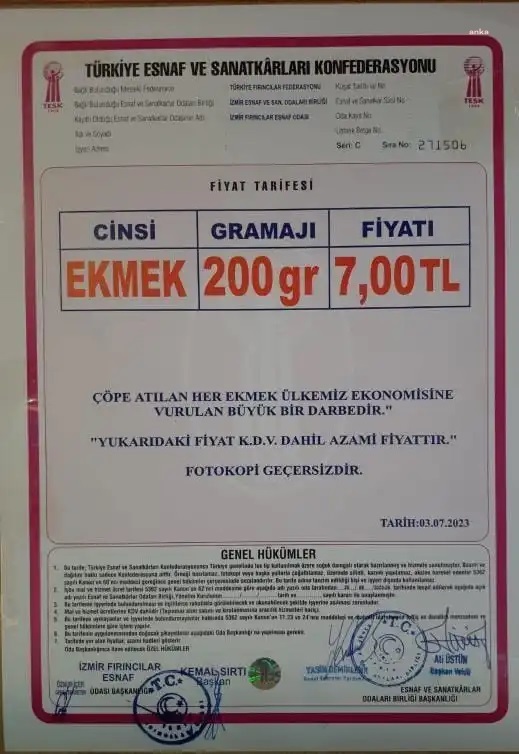 İzmir’de ekmeğe zam geldi. 5 liraya satılan 210 gram ekmeğin gramajı 200 grama indirildi. Gramajı düşürülen ekmeğin satış fiyatı da 7 liraya çıkarıldı.İzmir’de 2022 yılının kasım ayından bu yana 5 liraya satılan 210 gram ekmeğin hem gramajı hem de fiyatı değişti. 210 gram ekmeğin gramajı 10 gram düşürülerek 200 grama indirildi. 200 gram ekmeğin fiyatı ise 7 liraya yükseltildi.