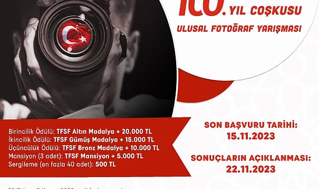 İzmir Büyükşehir Belediyesi, Cumhuriyet’in 100’üncü yıl coşkusunu İzmir’de düzenlenecek etkinliklerle belgelemek isteyen fotoğrafçılar için ulusal fotoğraf yarışması düzenliyor. Cumhuriyet tarihinin bu anlamlı gününde yapılacak etkinliklere arşiv olacak nitelikteki yarışmada 23 Ekim - 9 Kasım 2023 tarihleri arasında İzmir’deki kutlamalar sırasında çekilen fotoğraflar değerlendirilecek. Son katılım tarihinin 15 Kasım olduğu yarışmada birincilik ödülü 20 bin lira olacak.İzmir Büyükşehir Belediyesi, Cumhuriyet’in 100’üncü yılı kutlamaları kapsamında “İzmir’de Cumhuriyet’in 100. Yıl Coşkusu” konulu Ulusal Fotoğraf Yarışması düzenliyor. İzmir Büyükşehir Belediyesi Kültür ve Sanat Dairesi Başkanlığı tarafından düzenlenen yarışmada, fotoğraf sanatı aracılığı ile Cumhuriyet’in 100’üncü yılı kapsamında yapılacak etkinlik ve kutlamaların belgelenmesi, amatör-profesyonel fotoğrafçıların İzmir’de buluşturulması, kentteki bu tarihi günlere ait görsel bellek oluşturulması amaçlanıyor. Yarışmada 23 Ekim - 9 Kasım 2023 tarihleri arasında çekilen fotoğraflar değerlendirmeye alınacak.BİRİNCİLİK ÖDÜLÜ 20 BİN LİRATürkiye Fotoğraf Sanatı Federasyonu desteği ile düzenlenen yarışma fotoğrafa ilgi duyan 18 yaş üstü tüm amatör ve profesyonel fotoğrafçılara açık olacak. Yarışmaya İzmir kent merkezinin yanı sıra İzmir’in ilçelerinde ve köylerinde yapılacak her türlü etkinlikte (kutlama, yürüyüş, tören, konser, ışık ve lazer gösterileri, açılış, sergi, hava gösterileri, spor etkinlikleri, fener alayı v.b.) çekilen fotoğraflarla katılmak mümkün. Ancak geçmiş yıllarda çekilen fotoğraflar yarışmaya katılamayacak. Yarışmanın birincilik ödülü 20 bin, ikincilik ödülü 15 bin, üçüncülük ödülü 10 bin, mansiyon ödülü (3 adet) 5 bin TL olacak. Ayrıca sergilemeye değer bulunan 40 fotoğraf 500 TL ile ödüllendirilecek.SON BAŞVURU TARİHİ 15 KASIM 2023Seçici kurul üyeliğini Yusuf Tuvi, Tayfun Kocaman, Ahmet İmançer, Seda Şengök ve Mehmet Yasa’nın yapacağı yarışmaya katılmak isteyenler 15 Kasım 2023 tarihine kadar www.tfsfonayliyarismalar.org sitesi üzerinden online başvuruda bulunabilecek.