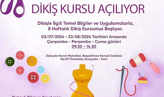 (İZMİR)- İzmir Büyükşehir Belediyesi Kadın Çalışmaları Şube Müdürlüğü, kadınlara yönelik Mor Makas Dikiş Kursu başlatıyor.Kadın istihdamına yönelik eğitim ve atölyeler düzenleyen İzmir Büyükşehir Belediyesi Kadın Çalışmaları Şube Müdürlüğü, Meslek Fabrikası iş birliği ile Mor Makas Dikiş Kursu projesini hayata geçirecek. Kadınların dikişle ilgili temel bilgiler alarak mesleğe adım atmasını hedefleyen İzmir Büyükşehir Belediyesi, yaz dönemini verimli geçirmek ve yeni bir beceri kazanmak isteyen kadınlara 8 haftalık eğitim verecek. 3 Temmuz’da başlayacak dikiş kursu, 23 Ağustos'ta sona erecek ve çarşamba, perşembe ve cuma günleri 09.30-14.30 saatleri arasında Karşıyaka Örnekköy’de bulunan yerleşkede yapılacak. Dikiş kursuna katılmak isteyen kadınlar, 232 293 33 72 numaralı telefondan başvuruda bulunabiliyor.