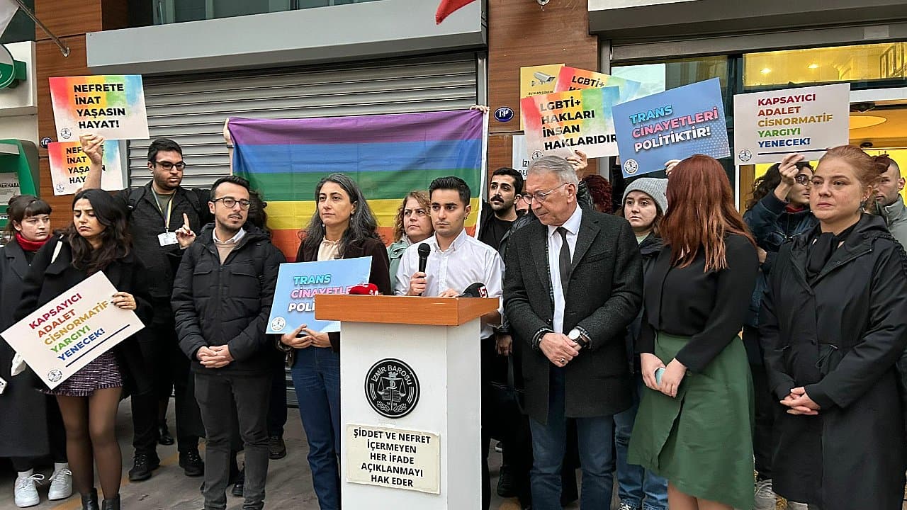 İzmir Barosu’nun 20 Kasım Nefret Suçu Mağduru Transları Anma Günü’nde düzenledikleri basın açıklaması, LGBTİ+ flamasının yasak olduğu gerekçesiyle polis tarafından engellenmek istendi. Açıklama yapan gruba, “Toplumun duyarlılığını da düşünmeniz gerek. Bayrağa müsaade edemeyiz, topluma kötü örnek olamazsınız” denilerek müdahale edildi. Kısa süreli arbede sonrasında açıklama okunabildi. İzmir Barosu, '20 Kasım Nefret Suçu Mağduru Transları Anma Günü' kapsamında baro önünde bu akşam basın açıklaması yapmak istedi. Basın açıklamasında açılan LGBTİ+ flaması nedeniyle güvenlik güçleri “Bu bayrak yasak, bayrağa müsaade edemem. Toplumun duyarlılığını da düşünmeniz gerek... Konumuz o bez parçası, topluma kötü örnek olamazsınız” uyarısında bulundu.Baro Başkanı Sefa Yılmaz, güvenlik güçlerine böyle bir yasağın olmadığını belirtti. Tartışma esnasında avukatlarla polisler arasında kısa süreli arbede yaşandı. “BİR KİŞİ DAHA EKSİLMEYECEĞİZ, NEFRETE İNAT YAŞASIN HAYAT”“Nefrete inat yaşasın hayat”, “Faşizme karşı omuz omuza” sloganı atan avukatlar, kısa süren arbedenin ardından basın açıklamasını tamamladı. Basın açıklamasını okuyan avukat Uzay Erbek, şöyle konuştu:“20 Kasım nefret üzerine kurulmuş bu çürümüş sisteme karşı açık bir direniştir. Nefret cinayetlerine son vermek, şiddetsiz bir toplum inşa etmek ve her bir bireyin potansiyelini özgürce yaşayabilmesi ve kendisini gönlünce var edebilmesi için birlikte çalışmak hepimizin ortak sorumluluğudur. İzmir Barosu olarak yapmış olduğumuz basın açıklamasıyla, ısrarlı biçimde ve şiddete başvurmak suretiyle sistemin dışına itilmeye çalışılan hiç kimseyi geride bırakmadan, içinde yaşadığımız toplumun daha adil ve eşit bir geleceğe sahip olabilmesi için çalıştığımızı ve çalışmaya da devam edeceğimizi bildiriyor, eşit ve adil bir dünya için birlikte mücadele etme çağrısında bulunuyoruz. Bir kişi daha eksilmeyeceğiz, nefrete inat yaşasın hayat!"