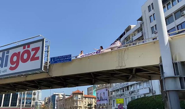(İZMİR)- TİP üyesi kadınlar, İzmir'de kadın cinayetlerini yaya üst geçidine pankart asarak protesto etti.TİP üyesi kadınlar, son dönemde artan kadın cinayetlerine dikkat çekmek amacıyla İzmir'in en hareketli ilçelerinden biri olan Konak'ta, yayaların yoğun olarak kullandığı Konak Pier Köprüsü olarak da bilinen Şehit Hava Pilot Üsteğmen Cenk Yeşilpınar yaya geçidine "Erkek şiddeti politiktir, kadınlar bitirecek" yazılı pankart astı.