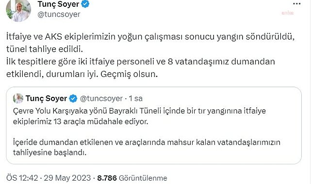 İzmir Çevreyolu üzerinde Bayraklı Tünellerinde bir TIR’da çıkan yangın yoğun uğraşlar sonunda söndürülürken TIR kullanılamaz hale geldi.İzmir Çevreyolu üzerinde bir TIR’da bugün yangın çıktı. Olay yerinde bulunan yurttaşların haber vermesiyle olay yerine çok sayıda polis, itfaiye ve sağlık ekipleri sevk edildi. Yoğun uğraşların ardından yanan TIR söndürüldü.İKİ İFTAİYE PERSONELİ VE 8 VATANDAŞ DUMANDAN ETKİLENDİİzmir Büyükşehir Belediye Başkanı Tunç Soyer, yangınla ilgili sosyal medya üzerinden yaptığı açıklamada “İtfaiye ve AKS ekiplerimizin yoğun çalışması sonucu yangın söndürüldü, tünel tahliye edildi. İlk tespitlere göre iki itfaiye personeli ve 8 vatandaşımız dumandan etkilendi, durumları iyi. Geçmiş olsun” ifadelerini kullandı.