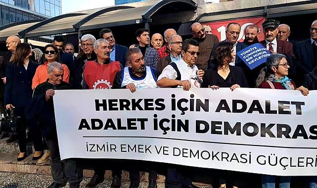 İzmir Emek ve Demokrasi Güçleri, bir kez daha Bayraklı Adliyesi önünde ‘Adalet Nöbeti’ için bir araya geldi. Nöbette konuşan Türkiye Devrimci İşçi Sendikaları Konfederasyonu (DİSK) Ege Bölge Temsilcisi Memiş Sarı, 25 Kasım Cumartesi günü gerçekleştirecekleri ‘Özgürlük Yürüyüşü’ için çağrıda bulundu. Sarı, “Yargı darbesine karşı yürüyeceğiz. Temel hak ve özgürlükler için yürüyeceğiz. O kadar çok ki yürüyeceğimiz şeyler, eğer bugün sessiz kalırsak yarın sıranın kime geleceğini bilmek için, yan yana durmak için, sarı öküzü vermemek için yürüyeceğiz” diye konuştu.