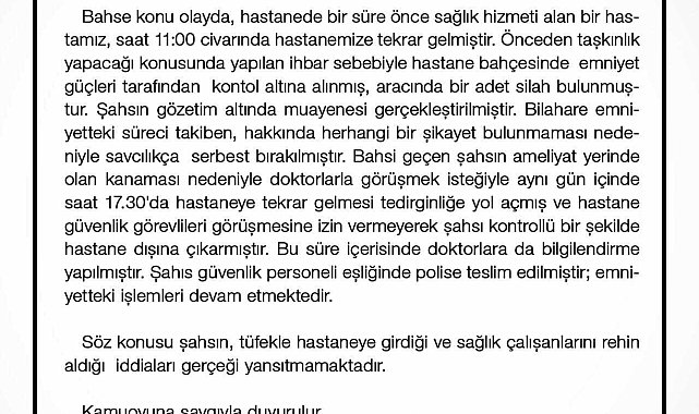 (İZMİR) - İzmir'de, dün bir kişinin pompalı tüfekle Bayraklı Şehir Hastanesi'ni bastığı iddialarıyla ilgili açıklama yapıldı. İzmir İl Sağlık Müdürlüğü, ''şahsın tüfekle hastaneye girdiği ve sağlık çalışanlarını rehin aldığı'' iddialarının gerçeği yansıtmadığını bildirdi.İzmir İl sağlık Müdürlüğü'nden yapılan yazılı açıklamada, "23 Nisan 2024 tarihinde İzmir Şehir Hastanesi'ne gelen bir hasta ile ilgili bazı sosyal medya hesaplarından yayılan yanıltıcı bilgiler nedeniyle aşağıdaki açıklamanın yapılması uygun görülmüştür" denilerek, şu ifadelere yer verildi:"Bahse konu olayda, hastanede bir süre önce sağlık hizmeti alan bir hastamız, saat 11:00 civarında hastanemize tekrar gelmiştir. Önceden taşkınlık yapacağı konusunda yapılan ihbar sebebiyle hastane bahçesinde emniyet güçleri tarafından kontol altına alınmış, aracında bir adet silah bulunmuştur. Şahsın gözetim altında muayenesi gerçekleştirilmiştir. Bilahare emniyetteki süreci takiben, hakkında herhangi bir şikayet bulunmaması nedeniyle savcılıkça serbest bırakılmıştır. Bahsi geçen şahsın ameliyat yerinde olan kanaması nedeniyle doktorlarla görüşmek isteğiyle aynı gün içinde saat 17.30'da hastaneye tekrar gelmesi tedirginliğe yol açmış ve hastane güvenlik görevlileri görüşmesine izin vermeyerek şahsı kontrollü bir şekilde hastane dışına çıkarmıştır. Bu süre içerisinde doktorlara da bilgilendirme yapılmıştır. Şahıs güvenlik personeli eşliğinde polise teslim edilmiştir; emniyetteki işlemleri devam etmektedir. Söz konusu şahsın, tüfekle hastaneye girdiği ve sağlık çalışanlarını rehin aldığı iddiaları gerçeği yansıtmamaktadır.''