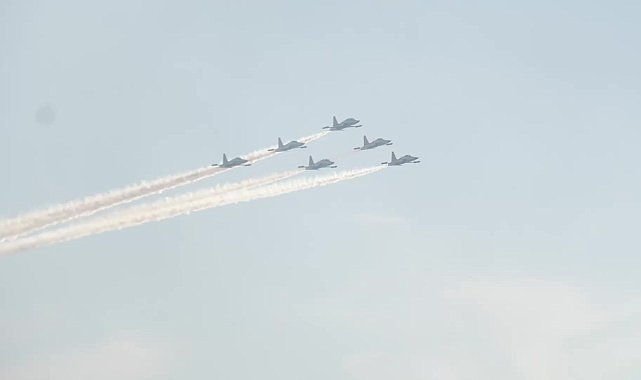 (İZMİR) – İzmir’in düşman işgalinden kurtuluşunun 103. yıl dönümü kutlamaları kapsamında, Türk Hava Kuvvetleri’nin akrobasi timi Türk Yıldızları ile SoloTürk, Gündoğdu Meydanı üzerinde gösteri uçuşu yaptı.Kutlamalar için Gündoğdu Meydanı’nda toplanan binlerce vatandaş, ellerinde Türk bayraklarıyla gösteriyi izledi. Türk Yıldızları ve SoloTürk’ün gökyüzünde yaptığı akrobatik manevralar uzun süre alkışlandı.Uçuşlar sırasında gökyüzünü renklendiren duman gösterileri büyük ilgi çekerken, vatandaşlar cep telefonlarıyla gösteriyi kaydetti. Meydanda coşkulu anlar yaşandı.