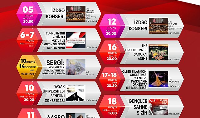 İzmir Büyükşehir Belediyesi Ahmed Adnan Saygun Sanat Merkezi (AASSM), Mayıs ayında dopdolu bir programla İzmirlilere sanat coşkusu yaşatacak.İzmir Büyükşehir Belediyesi Ahmed Adnan Saygun Sanat Merkezi (AASSM) Mayıs ayında dolu dolu bir programla sanatseverlerin karşısına çıkacak. Ressam, yazar, heykeltıraş, sanat tarihçisi Gürol Sözen’in “1919-23 Destan ve Onlar” sergisi 3 Mayıs’ta kapılarını açtı.18 Haziran’a kadar açık kalacak sergiyi İzmirliler, hafta içi 09.30-17.30, hafta sonu ise 12.00-17.00 saatleri arasında ücretsiz ziyaret edebilecek.GENÇ YETENEKLER SAHNEDEİzmir Büyükşehir Belediyesi, Alsancak Rotary Kulübü, İzmir Devlet Opera ve Balesi ve Dokuz Eylül Üniversitesi Devlet Konservatuvarı işbirliği ile düzenlenen 15. Ulusal Genç Solist Yarışması’nda dereceye girenler gala konserinde yeteneklerini gösterecek. Bugün saat 20.00'de yapılacak konsere katılım ücretsiz.İZDSO’DAN KONSERİzmir Devlet Senfoni Orkestrası 5 Mayıs’ta Büyük Salon’da şef Cem’i Can Deliorman’ın yönetiminde konser düzenleyecek. 12 Mayıs Cuma günü ise İzmir Devlet Senfoni Orkestrası, Büyük Salon’da saat 20.00’de şef Holly Choe yönetiminde sanatseverlerle buluşacak. Konsere katılmak isteyenler www.biletinial.com ya da İZDSO gişelerden biletlere ulaşabilecekler.6 MAYIS’TA POLONYALI EMİR SERGİSİAASSM, 6-26 Mayıs tarihleri arasında Polonyalı Emir: Waclaw Seweryn Rzewuski sergisine ev sahipliği yapacak. Polonyalı oryantalist ve seyyah Waclaw Seweryn Rzewuski'ye adanan sergi, Rzewuski'nin el yazmaları ve çizimlerinden oluşuyor. İzmirliler ücretsiz olarak sergiyi gezebilecek.AASSO BEETHOVEN ESERLERİNİ DİNLEYİCİYLE BULUŞTURACAKAhmed Adnan Saygun Senfoni Orkestrası (AASSO) 11 Mayıs Perşembe saat 20.00'de sanatseverlerle buluşacak. Ludwig van Beethoven eserlerinin dinleyiciyle buluşacağı konserde, orkestrayı ülkemizde genç kuşağın kayda değer müzisyenlerinden biri olan şef Tolga Taviş yönetecek. Konserin solisti ise 4 yaşında başladığı piyano eğitimine, devlet sanatçısı piyanist Gülsin Onay ve Salzburg Mozarteum Üniversitesinde Prof. Pavel Gililov ile devam eden 14 yaşındaki İlyun Bürkev olacak. Biletlere www.kultursanat.izmir.bel.tr adresinden ya da AASSM ve Kültürpark İsmet İnönü Sanat Merkezi gişesinden ulaşılabilir. (Gişe çalışma saatleri hafta içi 08.30-12.30, 13.30-17.30 arası)ÜNLÜ ANİME DİZİ MÜZİKLERİ SESLENDİRİLECEK38 Samuray Orkestrası, 2023 Avrupa turnesi kapsamında yapılacak görsel şov “Anime Super Stars”ı 16 Mayıs Salı günü saat 20.00’de AASSM’de sahneleyecek. Gösteriye orkestra müzisyenleri, rock grubu, koro ve yetenekli solistler katılarak en ünlü anime dizilerinden 20'den fazla film müziğini seslendirecek. Gösterinin biletlerine www.u-concert.com.tr adresinden ulaşılabiliyor.OLTEN FİLARMONİ ORKESTRASI, DANSLARIN SENTEZİ İLE BULUŞUYOROlten Filarmoni Orkestrası çok sesli müziği batıdan doğuya sentezlenen baleyle buluşturuyor. İzmir Devlet Opera ve Balesi dansçılarının Olten Filarmoni Orkestrası ile aynı sahnede yer alacağı konser 17-18 Mayıs tarihlerinde saat 20.30’da Büyük Salon’da İzmirlilerle buluşacak. Konserin biletlerine www.bilet.oltensanat.com adresinden ulaşılabiliyor.RİCHARD İLK KEZ AASSM’DEOkan Bayülgen, Shakespeare’in ünlü trajedisinden hareketle yazıp yönettiği Richard ilk kez AASSM’de 20-21 Mayıs tarihleri arasında sahnelenecek. Bayülgen’in de Richard karakterini canlandıracağı bu oyun, farklı disiplinlerden sanatçıları bir araya getiren Kabare Dada tarafından hayata geçiriliyor. İzmirliler oyunun biletlerine ise www.biletix.com üzerinden ulaşabiliyor.SEMA MORİTZ AASSM SAHNESİNDETürkiye’de ve Almanya’da Anadolu müziği üzerine çalışmalar yapan sanatçı Sema Moritz, 29 Mayıs’ta AASSM sahnesine konuk oluyor. Saat 20.00’de başlayacak konserin biletlerine ise www.aassm.org.tr, www.kultursanat.izmir.bel.tr adresinden ulaşılabiliyor.