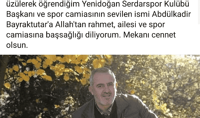 İzmit Belediye Başkanı Fatma Kaplan Hürriyet, geçirdiği trafik kazası sonucu hayatını kaybeden Yenidoğan Serdarspor Kulübü Başkanı Abdülkadir Bayraktutar için sosyal medya hesabından yayınlandığı mesajda, “Geçirdiği trafik kazasında hayatını kaybettiğini üzülerek öğrendiğim Yenidoğan Serdarspor Kulübü Başkanı ve spor camiasının sevilen ismi Abdülkadir Bayraktutar'a Allah'tan rahmet, ailesi ve spor camiasına başsağlığı diliyorum. Mekanı cennet olsun.” ifadelerini kullandı.İzmit Belediye Başkanı Fatma Kaplan Hürriyet, geçirdiği trafik kazası sonucu hayatını kaybeden Yenidoğan Serdarspor Kulübü Başkanı Abdülkadir Bayraktutar için başsağlığı mesajı yayınladı. Kaplan Hürriyet’in sosyal medya paylaşımı şöyle:“Geçirdiği trafik kazasında hayatını kaybettiğini üzülerek öğrendiğim Yenidoğan Serdarspor Kulübü Başkanı ve spor camiasının sevilen ismi Abdülkadir Bayraktutar'a Allah'tan rahmet, ailesi ve spor camiasına başsağlığı diliyorum. Mekanı cennet olsun.”