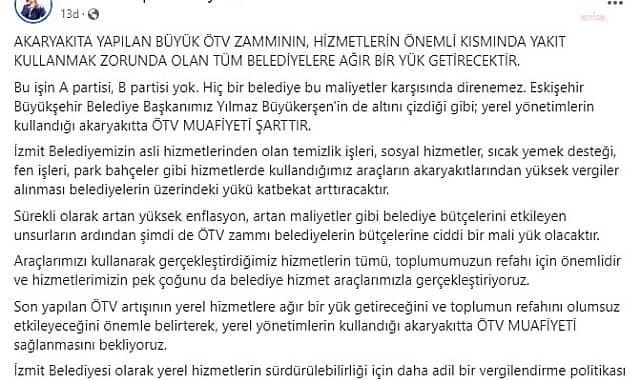 Son yapılan ÖTV artışının yerel hizmetlere ağır bir yük getireceğini ve toplumun refahını olumsuz etkileyeceğini önemle belirterek, yerel yönetimlerin kullandığı akaryakıtta ÖTV muafiyeti sağlanmasını bekliyoruz. İzmit Belediyesi olarak yerel hizmetlerin sürdürülebilirliği için daha adil bir vergilendirme politikası ve alternatif çözümler bulunmasını talep ediyoruz."