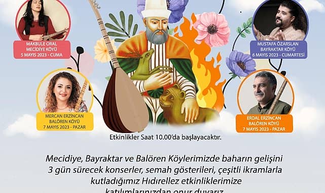 İzmit Belediyesi Kültür ve Sosyal İşler Müdürlüğü bünyesinde köy muhtarlıkları ile birlikte gerçekleşecek Hıdırellez Şenlikleri, Balkan Dernekleri Yerleşkesi’nin yanı sıra 3 gün boyunca köylerde de devam edecek. Programlar kapsamında 5 Mayıs Cuma günü Mecidiye Köyü’nde, 6 Mayıs Cumartesi günü Bayraktar Köyü’nde ve 7 Mayıs Pazar günü Balören Köyü’nde birbirinden renkli etkinlikler gerçekleştirilecek.