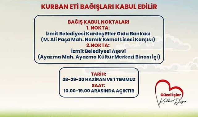 Kurban Bayramı’nda Gıda Bankası ve Aşevi üzerinden bağışlanacak kurban etlerini ihtiyaç sahiplerine ulaştıracak olan İzmit Belediyesi, bağış yapmak isteyen vatandaşları Kurban Bayramı boyunca Gıda Bankası ve Aşevi’ne bekliyor. İzmit Belediyesi, bu yıl da Kurban Bayramı’nda hayırseverler ve ihtiyaç sahipleri arasında köprü kuracak. İzmit Belediyesi, Kurban Bayramı boyunca hayırseverlerin bağışlayacağı etleri kabul ederek bağışları ihtiyaç sahibi ailelere eşit şekilde pay edecek. Aşevi ve Gıda Bankası, bağışları kabul etmek için bayram boyunca 10.00 ile 19.00 saatleri arasında açık olacak.