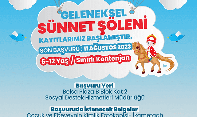 İzmit Belediyesi’nin ihtiyaç sahibi ailelere destek olmak amacıyla düzenlediği Toplu Sünnet Şöleni’nde yoğun talep nedeniyle ikinci kayıt dönemi başladı. İzmit Belediyesi Sosyal Destek Hizmetleri Müdürlüğü, sosyal dayanışma ve yardımlaşma hedefiyle kentte yaşayan ihtiyaç sahibi ailelere destek olmak için bu yıl da Toplu Sünnet Şöleni düzenleyecek. 6-12 yaş arası çocukların kabul edileceği etkinliğin ikinci başvuru kayıtları, 11 Ağustos 2023 tarihine kadar devam edecek.Yapılacak değerlendirmenin ardından başvurusu kabul edilen aileler, çocuklarını anlaşmalı hastanelerde sünnet ettirebilecek. İzmit Belediyesi; sünnet kıyafetleri, fotoğraf çekimleri, sünnet konvoyu ve ikramlarla çocuklara güzel bir anı bırakacak.İhtiyaç sahibi aileler, 11 Ağustos’a kadar Belsa Plaza B Blok 2. katta bulunan Sosyal Destek Hizmetleri Müdürlüğü’ne başvurularını yüz yüze yapabilecek. Başvuruda ebeveyn ve çocuğun kimlik fotokopileri ile ikametgah belgeleri yeterli olacak. Vatandaşlar ayrıntılı bilgi için 0262 318 00 00 numaralı telefonu arayarak detayı bilgi edinebilecek.