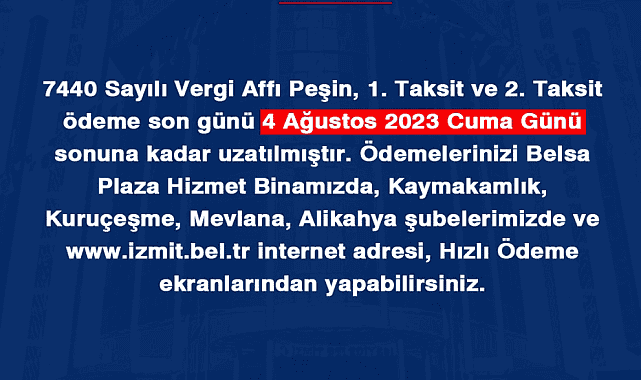 İzmit Belediyesi, alacakların yeniden yapılandırılmasına ilişkin kanun çerçevesinde borçlarını yapılandıran mükelleflerin peşin veya taksit ödeme işlemleri için son ödeme tarihinin 4 Ağustos Cuma gününe kadar uzatıldığını duyurdu.İzmit Belediyesi Mali Hizmetler Müdürlüğü, 7440 Sayılı Bazı Alacakların Yeniden Yapılandırılmasına İlişkin Kanun çerçevesinde borçlarını yapılandıran mükelleflerin peşin veya taksit ödeme işlemlerinin son ödeme tarihinin 4 Ağustos Cuma gününe kadar uzatıldığını duyurdu. Vatandaşlar Cuma günü saat 17.30’a kadar İzmit Belediyesi Belsa A Blok 3. Kat Mali Hizmetler Müdürlüğü, Kaymakamlık, Kuruçeşme – Mevlana – Alikahya şubelerine veya www.izmit.bel.tr internet adresi hızlı ödeme ekranlarından ödeme yapabilecek.