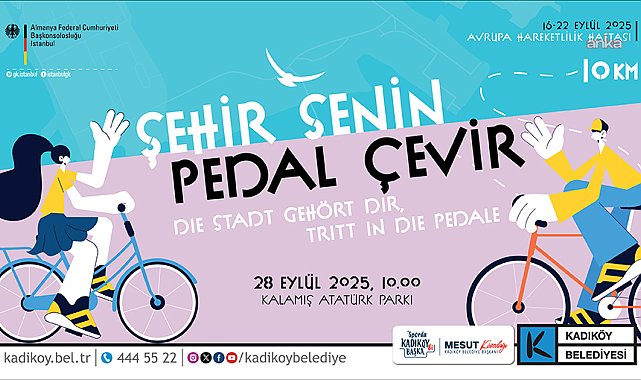 (İSTANBUL)- Kadıköy Belediyesi ve Almanya Federal Cumhuriyeti İstanbul Başkonsolosluğu iş birliğiyle, Avrupa Hareketlilik Haftası kapsamında düzenlenecek "Şehir Senin, Pedal Çevir" etkinliğiyle bisikletliler, 28 Eylül Pazar günü Kadıköy’de buluşacak. Avrupa Hareketlilik Haftası kapsamında düzenlenecek "Şehir Senin, Pedal Çevir" etkinliğinde bisikletliler, Kadıköy’de buluşacak. Kadıköy Belediyesi ile Almanya Federal Cumhuriyeti İstanbul Başkonsolosluğu iş birliğiyle düzenlenecek bisiklet turu, 28 Eylül Pazar günü yapılacak. Kalamış Atatürk Parkı’ndan saat 10.00’da başlayacak tur, aynı noktada sona erecek. Etkinliğin startını Belediye Başkanı Mesut Kösedağı ile Almanya Başkonsolosu Dr. Regine Grienberger birlikte verecek.Tur, Kalamış Atatürk Parkı’nda sona erecekHer yaştan katılımcıya açık olan etkinlik, "Şehir Senin, Pedal Çevir" sloganıyla 10 kilometrelik parkurda gerçekleştirilecek. Bisikletliler, sahil şeridinden ilerleyerek Ahmet Mithat Efendi Caddesi’ne çıkacak, Çetin Emeç Bulvarı üzerinden devam ederek Bostancı’ya gelmeden Oramiral Celal Eyicioğlu Sokak’tan Bağdat Caddesi’ne ulaşacak. Tur, başlangıç noktası olan Kalamış Atatürk Parkı’nda sona erecek.