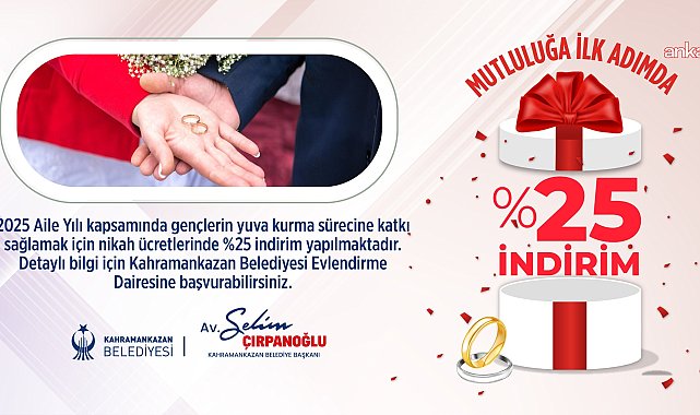 (ANKARA) - Kahramankazan Belediyesi, evlilik hazırlığı yapan genç çiftlere destek olmak amacıyla nikah ücretlerinde yüzde 25 indirim uygulamasına geçti.Kahramankazan Belediyesi, yeni evlenecek çiftlerin maddi yükünü hafifletmek amacıyla nikah ücretlerinde yüzde 25 indirime gitti. 2025 yılı boyunca geçerli olacak indirimden 18-29 yaş aralığında olan, ilk kez evlenecek ve ilçede ikamet eden çiftler faydalanabilecek.Uygulama hem ilçe sınırları içerisinde hem de ilçe dışında gerçekleştirilecek nikah törenlerinde geçerli olacak.İndirimli nikah ücretlerinden yararlanmak isteyen çiftler, Kahramankazan Belediyesi Evlendirme Dairesi’ne başvurabilecek.