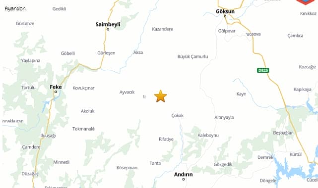 AFAD; Kahramanmaraş’ın Andırın ilçesinde saat 06.38’de, 6.99 kilometre derinlikte, 4.2 büyüklüğünde deprem olduğunu açıkladı.AFAD; Kahramanmaraş’ın Andırın ilçesinde saat 06.38’de, 6.9 kilometre derinlikte, 4.2 büyüklüğünde deprem olduğunu bildirdi. Kandilli Rasathanesi ise; Andırın ilçesinin Çiğşar mahallesinde 5 kilometre derinlikte, 4.3 büyüklüğünde deprem olduğunu açıkladı.