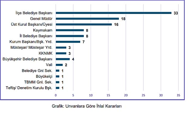 Kamu Görevlileri Etik Kurulu’nun 2022 yılı faaliyet raporuna göre “hediye alma ve menfaat sağlama, savurganlıktan kaçınma, görev ve yetkilerin menfaat sağlamak amacıyla kullanılmaması, saygınlık ve güven” gibi etik ilkeler 106 kez ihlal edilirken, ihlal edenler arasında TBMM Genel Sekreteri, büyükşehir belediye başkanı, vali, teftiş ve denetim kurulu başkanı gibi makamlardaki isimler de yer aldı. En çok etik ihlal yapanlar ise ilçe belediye başkanları oldu.Kamu Görevlileri Etik Kurulu’nun 2022 faaliyet raporunda, 2017-2022 yılları arasında etik ihlal yapan kamu görevlilere ilişkin veriler yer aldı. Rapora göre 6 yılda 289 etik ihlal yapıldı ve 106 ihlal kararı verildi.Raporda, etik ilkeleri ihlal eden makamlar ve ihlal konuları da yer aldı. Etik ilkeleri ihlal edenler arasında; TBMM Genel Sekreteri, büyükşehir belediye başkanları, il ve ilçe belediye başkanları, üst kurul başkanı ve üyeleri, büyükelçi gibi makamlar da yer aldı. İhlal konuları ise raporda; “hediye alma ve menfaat sağlama, savurganlıktan kaçınma, saygınlık ve güven” olarak sıralandı.Rapora göre; en çok ilçe belediye başkanları etik ihlal yaptı. Rapora göre etik ihlali verilen kamu görevlileri şöyle:“- İlçe belediye başkanları 33 etik ihlal.- Genel müdür 18 etik ihlal.- Kaymakam 8 etik ihlal.- İl belediye başkanları 8 etik ihlal.- Kurum başkanı ve başkan yardımcıları 7 etik ihlal.- Müsteşar, müsteşar yardımcısı 3 etik ihlal.- Kamu kurumu niteliğindeki meslek kuruluşu 3 etik ihlal.- Büyükşehir belediye başkanları 4 etik ihlal.- Vali 2 etik ihlal.- Belediye genel sekreteri 1 etik ihlal.- Büyükelçi 1 etik ihlal.- TBMM Genel Sekreteri 1 etik ihlal.- Teftiş ve denetim kurulu başkanı 1 etik ihlal.”Rapora göre en çok “saygınlık” ve “güven” konusunda etik ihlali yapıldı. Saygınlık ve güven konusunda yapılan 76 etik ihlali, sırasıyla şu ihlaller takip etti:“74 etik ihlal ile dürüstlük ve tarafsızlık, 25 etik ihlal ile savurganlıktan kaçınma, 21 etik ihlal ile kamu malları ve kaynaklarının kullanımı, 16 etik ihlal ile görev ve yetkilerin menfaat sağlamak amacıyla kullanılmaması, 15 etik ihlal ile yöneticilerin hesap verme sorumluluğu, 13 etik ihlal ile çıkar çatışmasından kaçınma, 12 etik ihlal ile hizmet standartlarına uymama, 8 etik ihlal ile amaç ve misyona bağlılık, 7 etik ihlal ile görevin yerine getirilmesinde kamu hizmeti bilinci, 7 etik ihlal ile nezaket ve saygı, 6 etik ihlal ile halka hizmet bilinci, 4 etik ihlal ile hediye alma ve menfaat sağlama yasağı, 2 etik ihlal ile bağlayıcı açıklamalar ve gerçek dışı beyan, 2 etik ihlal ile bilgi verme, saydamlık ve katılımcılık, 1 etik ihlal ile eski kamu görevlileri ile ilişkiler.”