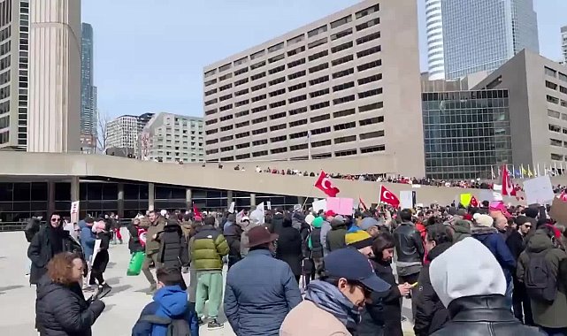 Haber: Nilgün Hande ÖZTÜRK(ANKARA) - İstanbul Büyükşehir Belediye (İBB) Başkanı Ekrem İmamoğlu ve beraberinde çok sayıda kişinin 19 Mart’ta gözaltına alınmasının ardından yurt genelinde başlayıp dünyaya yayılan protesto gösterileri, dün, Kanada’nın en büyük şehri ve ticaret merkezi Toronto’da da düzenlendi.İBB Başkanı Ekrem İmamoğlu’nun tutuklanması ve görevden uzaklaştırılması, Kanada’nın Toronto kentinin Nathan Philips Meydanı’nda dün protesto edildi.Çok sayıda kişinin katıldığı protesto gösterilerinde, meydanda toplananlar ellerinde, Türkçe ve İngilizce döviz ve pankartlar taşıdı. CHP Kanada Birliği üyelerinin de arasında bulunduğu göstericiler, Türkiye’deki protesto gösterilerine katılanlarla dayanışma içinde olduklarını belirterek, "Toronto’dan ODTÜ’ye selam. Direnişe devam" yazılı pankart da taşıdı.Meydandaki protestocuların Türk bayrakları taşıdıkları da görülürken, çeşitli sloganlar eşliğinde, Türk makamlarından hem İmamoğlu’nun serbest bırakılması hem de “demokrasi ve adalet” talebinde bulunuldu.