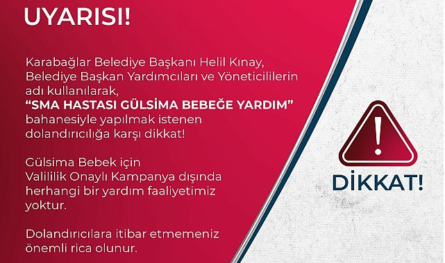 (İZMİR) - İzmir Karabağlar Belediyesi, Belediye Başkanı Helil Kınay ve diğer belediye yöneticilerinin isimleri kullanılarak “SMA hastası Gülsima bebeğe yardım” bahanesiyle dolandırıcılık yapılmak istendiğini bildirerek, yurttaşları uyardı. Kendilerini Karabağlar Belediyesi Başkanı Helil Kınay, belediye başkan yardımcısı, üst düzey yönetici veya belediye personeli olarak olarak tanıtan bazı kişi ya da kişilerin, Karabağlar'da yaşayan SMA hastası Gülsima bebek için vatandaşlardan para istedikleri yönünde ihbarlar alınması üzerine Karabağlar Belediyesi’nden açıklama yapıldı.Açıklamada, Gülsima bebek için Valilik onaylı kampanya dışında herhangi bir yardım faaliyeti yürütülmediği hatırlatılarak, “Bu anlamda Karabağlar Belediyesi'nin de yürüttüğü bir yardım kampanyası bulunmamaktadır ve bunun için IBAN verilmesi kesinlikle söz konusu değildir. Vatandaşlarımızın bu tür olaylarla karşılaşmaları halinde durumu derhal emniyete bildirmeleri gerekmekte olup, herhangi bir talepte bulunarak kendilerinden yardım isteyen dolandırıcılara itibar etmemeleri önemli rica olunur” denildi.