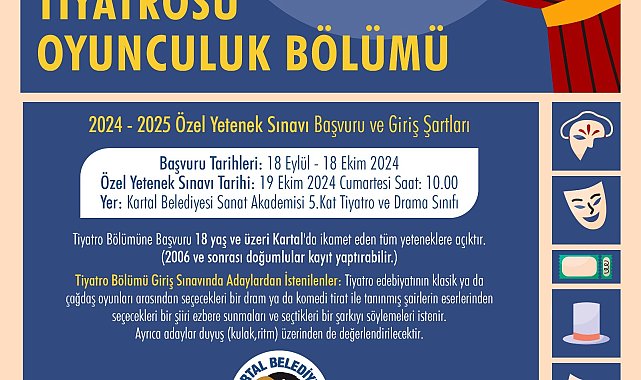 (İSTANBUL)- Kartal Belediye Tiyatrosu, 2023-2024 eğitim dönemi için ön kayıtları almaya başladı. Tiyatro bölümüne, 18 yaş ve üzeri Kartal’da ikamet eden herkes başvurabilecek. 18 Eylül-18 Ekim 2024 tarihleri arasında Kartal Belediyesi’nin internet sitesi üzerinden başvurular alınacak. Özel Yetenek Sınavı 19 Ekim 2024 Cumartesi günü saat 10.00’da Kartal Belediyesi Sanat Akademisi 5'inci kat Tiyatro ve Drama Sınıfı’nda yapılacak.Özel Yetenek Sınavı'na katılacak olanlardan, tiyatro edebiyatının klasik ya da çağdaş oyunları arasından seçecekleri bir dram ya da komedi tirat ile tanınmış şairlerin eserlerinden seçecekleri bir şiiri ezbere sunmaları ve seçtikleri bir şarkıyı söylemeleri istenecek. Ayrıca adaylar duyuş (kulak,ritm) üzerinde de değerlendirilecek.