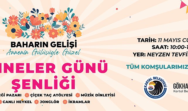 (İSTANBUL)- Kartal Belediyesi, ‘Baharın Gelişi Annelerin Gülüşüyle Güzel’ sloganıyla Anneler Günü’nü birbirinden farklı etkinliklerle kutlamaya hazırlanıyor.Neyzen Tevfik Meydanı’nda 11 Mayıs Cumartesi günü 10.00-19.00 saatleri arasında düzenlenecek ‘Anneler Günü Şenliği’ kapsamında çiçek taç atölyesi, kadın emeği pazarı, müzik dinletileri, canlı heykel, jonglör gösterileri gibi birçok etkinlik yer alacak.Kadın ve Aile Hizmetleri Müdürlüğü tarafından organize edilen şenlikte Kartallı kadınların, kent ekonomisine katılması, sosyal ve ekonomik hayatta desteklenmesi için hayata geçirilen, ‘Kadın Emeği Pazarı’ stantları meydanda yer alacak. Kartal Belediye Başkanı Gökhan Yüksel de tüm annelerin Anneler Günü'nü kutlayarak, Kartallı anneleri ve çocukları düzenleyecekleri etkinliğe davet etti.