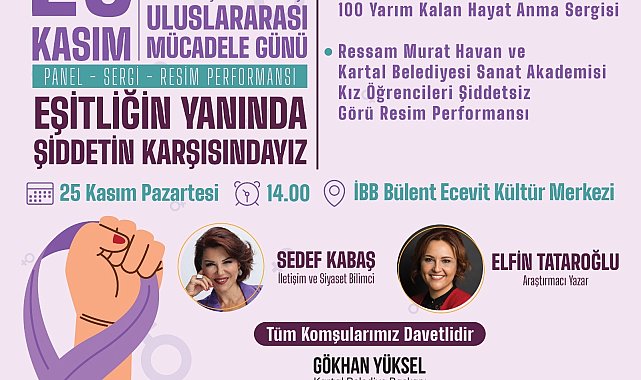 (İSTANBUL) - Kartal Belediyesi, 25 Kasım Kadına Yönelik Şiddete Karşı Uluslararası Mücadele ve Dayanışma Günü dolayısıyla “Eşitliğin Yanında Şiddetin Karşısındayız” isimli bir panel düzenleyecek.Kartal Belediyesi Kadın ve Aile Hizmetleri Müdürlüğü’nün girişimiyle 25 Kasım 2024 Pazartesi günü saat 14.00’te İstanbul Büyükşehir Belediyesi (İBB) Kartal Bülent Ecevit Kültür Merkezi’nde gerçekleşecek “Eşitliğin Yanında Şiddetin Karşısındayız” panelinde; gazeteci, haber sunucusu, televizyon programcısı, iletişim ve siyaset bilimci ve eğitmen Sedef Kabaş ile araştırmacı-yazar ve akademisyen Elfin Tataroğlu konuşmacı olarak yer alacak.Etkinlik alanında bir de sergi düzenlenecek. “100 Kadın, 100 Yarım Kalan Hayat Anma” isimli sergide yıllardır hafızalara kazınan ve kadına yönelik şiddetle mücadelenin sembolü haline gelen kadınların yanı sıra 2024 yılında yaşamdan koparılan kadınların anısına hayat hikayeleri ve fotoğrafları sergilenecek. Anma kapsamında sergi alanına karanfil bırakılacak.Günün bir diğer etkinliğini ise Kartal Belediyesi Sanat Akademisi üstlenecek. “El Ele Vererek Birlikte Güçlüyüz” temasıyla ressam Murat Havan ve Kartal Belediyesi Sanat Akademisi’nin kız öğrencileri, “Şiddetsiz Görü” adını taşıyan canlı bir resim performansı gerçekleştirecek.
