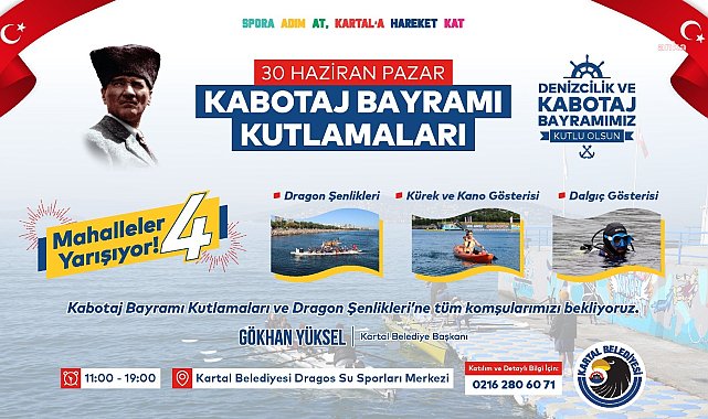 (İSTANBUL) - Kartal’da Dragos Su Sporları Merkezi, 1 Temmuz Denizcilik ve Kabotaj Bayramı kutlamalarının merkezi olacak.Kartal Belediyesi Gençlik ve Spor Hizmetleri Müdürlüğü organizasyonu ile 1 Temmuz Denizcilik ve Kabotaj Bayramı kapsamında coşkulu bir kutlama etkinliği düzenliyor. Etkinlik, 30 Haziran Pazar günü 11.00-19.00 saatleri arasında Dragos Su Sporları Merkezi’nde yapılacak.‘Mahalleler Yarışıyor Dragon Bot Yarışları’ etkinliğinde, 18 yaş üstü sporseverler doyasıya yarışacak. Her mahallenin ayrı bir takım kuracağı organizasyonda, başvurular mahalle muhtarlıkları üzerinden yapılacak.Tüm sporseverleri etkinliğe davet eden Kartal Belediye Başkanı Gökhan Yüksel, şunları söyledi:“Denizlerimizdeki hâkimiyet ve bağımsızlığımızın sembolü olan 1 Temmuz Denizcilik ve Kabotaj Bayramı dolayısıyla İstanbul’un en güzel sahil kıyılarından birine sahip olan Kartal’da renkli bir kutlama programı organize ettik. Birbirinden heyecanlı su sporları yarışları ve gösterilerine imza atacağımız etkinlik programımızı ise ilçemizin sahip olduğu zengin potansiyeli en iyi şekilde değerlendirerek komşularımızın hizmetine açtığımız Dragos Su Sporları Merkezimizde gerçekleştireceğiz. Hazırladığımız bu heyecan dolu etkinliğe tüm sporsever komşularımızı bekliyoruz.” Vatandaşlar, etkinliğe katılım hakkında detaylı bilgiye 0216 280 60 71 numaralı hattan ulaşabilecek.