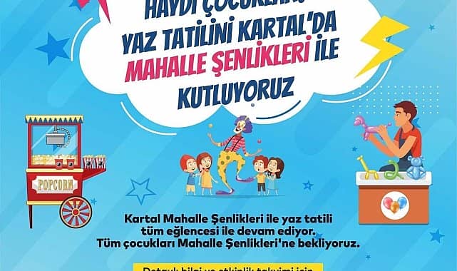 Kartal Belediyesi, yaz tatiline giren öğrencileri, birbirinden renkli ve eğlenceli aktivitelerin yer aldığı ‘Mahalle Şenlikleri’ ile buluşturacak. Kartal’ın 20 mahallesinde düzenlenecek Mahalle Şenlikleri yarın başlıyor. ‘Haydi Çocuklar! Yaz Tatilini Kartal’da Mahalle Şenlikleri ile Kutluyoruz’ sloganıyla yapılacak etkinliklerde, çocuklar arkadaşlarıyla birlikte zaman geçirip çeşitli oyunlar oynaması hedefleniyor. Mahalle Şenlikleri’nin ilki 4 Temmuz Salı günü (yarın) Uğur Mumcu Mahallesi, Uğur Mumcu Kültür Merkezi bahçesinde 15.00-19.00 saatleri arasında yapılacak. 5 Temmuz Çarşamba günü Yakacık Çarşı Mahallesi’nde yer alan Bayram Demirkol Parkı’nda devam edecek eğlence, 18 Ağustos Cuma gününe kadar Kartal’ın tüm mahallelerine taşınacak.Kartal Belediye Başkanı Gökhan Yüksel, “Kartal Belediyesi olarak, yaz tatilinde Kartallı çocuklarımız ile eğlence dolu anlar yaşayacağımız Mahalle Şenliği’ne hazırlanıyoruz” dedi.