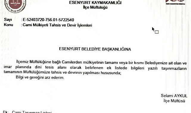 (İSTANBUL) - Esenyurt’un seçilmiş Belediye Başkanı Ahmet Özer’in yerine atanan kayyumun, ilçedeki 37 caminin mülkiyetini, encümen kararı ile müftülüğe devrettiği ortaya çıktı. CHP’li Belediye Meclis Üyesi Erdinç Aktaş, devir işlemindeki asıl amacın camilerin altında bulunan dükkanlar olduğunu iddia etti.İBB Meclisi’nin aralık ayı toplantısında gündem dışı konuşma yapan CHP’li Erdinç Aktaş, Esenyurt Belediyesi’ne atanan kayyum yönetiminin icraatlarını konu aldı. Esenyurt Belediyesi’nin mülkiyetinde bulunan arazilerin başka kurumlara devredilmesini eleştiren Aktaş, ayrıca ilçede üzerinde cami bulunan birçok parselin de müftülüğe devredildiğini söyledi. Aktaş, “Müftülük bir yazı göndermiş. 37 cami yerini bize bağlayın diye. Amacınızın cami olmadığını biliyoruz ki amaç caminin altındaki işletmeler. Oraya çökmeye çalışıyorsunuz.”"Müftülük istedi Kayyum verdi"Camilere ait mülkiyetlerin, Esenyurt Müftülüğü’ne devredilmesiyle ilgili talebin, seçilmiş Belediye Başkanı Ahmet Özer’in görevden alınmasından bir ay sonra yapıldığı öğrenildi. Esenyurt Müftülüğü, 28 Kasım 2024 tarihinde Esenyurt Belediyesi’ne bir yazı göndererek, 37 caminin mülkiyetinin kendilerine devredilmesini istedi. Esenyurt Belediyesi Emlak ve İstimlak Müdürlüğü tarafından, Belediye Encümeni’ne gönderilen yazıda şöyle denildi:“İlçe Müftülüğü’ne ait yazıda, İlçemiz Müftülüğüne bağlı camilerden, mülkiyetinin tamamı veya bir kısmı idaremize ait olan ve uygulama imar planında ‘Dini Tesis Alanı’ olarak belirlenen taşınmazların tamamının Müftülüğe tahsisi hususu talep edilmektedir. Bahse talep konusu üzerine, ‘mülkiyeti Esenyurt Belediyesine ait olan camiler’, ‘mülkiyetinde Esenyurt Belediyesinin hissesi bulunan camiler’, ‘hüküm ve tasarrufu idaremize ait tescil harici alanlarda bulunan camilerin’ ve uygulama imar planlarında dini tesis alanı olarak belirlenen taşınmazların tamamının ekli listede belirtildiği şekilde Müftülüğe 5393 sayılı Belediye Kanunu’nun 75. Maddesinin (d) fıkrası gereğince 25 yıl süre ile tahsisi hususunda karar alınmak üzere yazımızın; 5393 Sayılı Belediye Kanunu’nun 31 inci maddesinin son fıkrası ve yanı kanunun 45 inci maddesinin ek fıkrası gereğince Belediye Encümeni’ne havalesini olurlarınıza arz ederim.”“Müftü Aykul’un talebi”Esenyurt Müftüsü Selami Aykul’un imzasıyla, camilerin devredilmesiyle ilgili olarak Esenyurt Belediyesi’ne gönderilen yazıda ise şöyle denildi:“İlçe Müftülüğüne bağlı camilerden mülkiyetinin tamamı veya bir kısmı Belediyenize ait olan ve imar planlarında dini tesis alanı olarak belirlenen ek listede bilgileri yazılı taşınmazların tamamının Müftülüğümüze tahsis ve devrinin yapılması hususunda; bilgi ve gereğini arz ederim.”