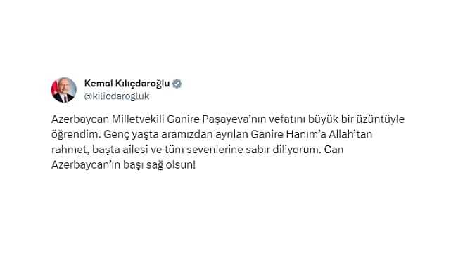 CHP Genel Başkanı Kemal Kılıçdaroğlu, bu akşam hayatını kaybeden Azerbaycan Milletvekili Ganire Paşayeva için; "Azerbaycan Milletvekili Ganire Paşayeva’nın vefatını büyük bir üzüntüyle öğrendim. Genç yaşta aramızdan ayrılan Ganire Hanım’a Allah’tan rahmet, başta ailesi ve tüm sevenlerine sabır diliyorum. Can Azerbaycan’ın başı sağ olsun" açıklamasını yaptı.
