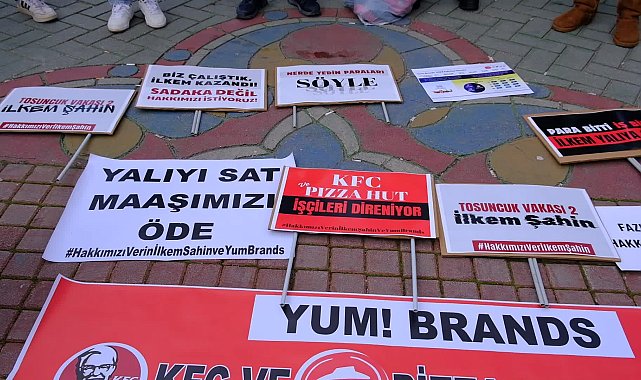 İşçiler adına açıklama yapan Esra Özdemir, Eskişehir’de işten çıkarılanlarla beraber yaklaşık 100 işçinin mağdur olduğunu belirterek, "En çok merak edilen iki konuya açıklık getirmek istiyorum, birinci konu, 537 restoran boykot sonucu kapanmadı. Yum Brands 2024 yılında 7.5 milyar dolar gelir elde ettiğini, 1,5 milyar dolar karı sermayesine kattığını resmi sitesinde açıklamıştır. Boykot sonuç verseydi şu an sokaklarda 7 bin Türk işçisi değil, Yum olurdu. İkinci konu, iflas edecek restoranlarda neden çalışmaya devam ettik?" şeklinde konuştu. Yum Brands şirketine bağlı KFC ve Pizza Hut'ın Türkiye işletmesi İş Gıda'nın CEO'su İlkem Şahin'in, 2020'de Yum Brands’tan aldığı 170 adet KFC ve Pizza Hut restoranlarını, yeni restoranlar açarak 537’ye çıkardığını söyleyen Özdemir, Şahin'in şirketinin birçok iş kolunda büyümeye devam ettiğini belirtti."Maaşlarımızı alamadığımız ocak ayında 50 milyon değerinde yalı almıştır"Özdemir, "Maaşlarımızı alamadığımız ocak ayında Elif Gökçe Şahin adına 32 milyon değerinde Krispy Kreme devretmiştir, 50 milyon değerinde yalı almıştır. Bu tabloya göre siz olsaydınız İlkem Şahin iflas edecek der miydiniz? Hepsinden önemlisi, babasının serveti sayesinde sülalesinin ömrünü garantilemiş bir patronun konkordato hakkı varken, biz işçilerin hiç hakkı yok mu?" ifadelerini kullandı.İşçi Nazmiye Ergin de "Kepenkleri indirilen restoranları burada gördüğünüz ve burada göremediğiniz 7 bin işçiyle beraber sırtımızda taşıdık. Bizim tek isteğimiz haklarımız. Biz dilenci değiliz" dedi. İş Gıda CEO'su İlkem Şahin'in, "Evim için, çocuklarım için çalışıyorum" dediğini aktaran Ergin, "Bizim çocuklarımızın hakları, bizim çocuklarımızın geleceği nerede? Bizim haklarımızla, bizim tazminatlarımızla, bizim ocak maaşımızla aldığın yalıda o çocuklarınla nasıl oturacaksın? Bu soğukta, bizim evimizde olan soğukluk senin canını acıtmıyor mu? Biz haklarımızı istiyoruz. Başka hiçbir şey istemiyoruz" diye konuştu.