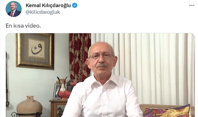 Millet İttifakı Cumhurbaşkanı Adayı Kemal Kılıçdaroğlu, Twitter hesabında “En kısa video” notuyla yaptığı dört saniye süreli paylaşımda; “Bugün, dünden daha fakirsen tek sebebi Erdoğan” dedi.CHP Genel Başkanı, Millet İttifakı Cumhurbaşkanı Adayı Kemal Kılıçdaroğlu, Twitter hesabında, “En kısa video” notuyla bir paylaşım yaptı. Kılıçdaroğlu, videoda; “Bugün, dünden daha fakirsen tek sebebi Erdoğan. İyi akşamlar” dedi.