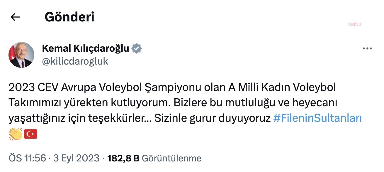 CHP Genel Başkanı Kemal Kılıçdaroğlu, “2023 CEV Avrupa Voleybol Şampiyonu olan A Milli Kadın Voleybol Takımımızı yürekten kutluyorum. Bizlere bu mutluluğu ve heyecanı yaşattığınız için teşekkürler. Sizinle gurur duyuyoruz Filenin Sultanları” dedi.